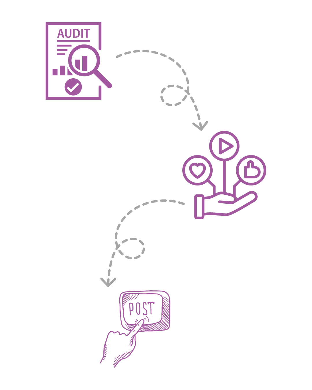 Content is created as outlined in the strategy along with post-sheduling and platform management. A content calendar is built with post-scheduling, inbox and comment monitoring and management, and a metrics report is completed every three months to measure success, and evaluate what worked and any areas and adjustments to the strategy.